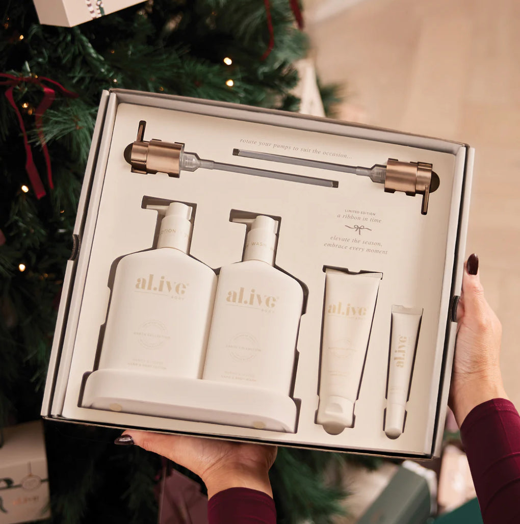 This premium gift set includes our signature interlocking bottles in a coordinating tray, complete with Hand Wash, Hand Lotion, Hand Cream, and Lip Butter. Interchangeable bronze pumps provide added versatility, allowing the set to be styled seasonally or offered as a timeless piece throughout the year.