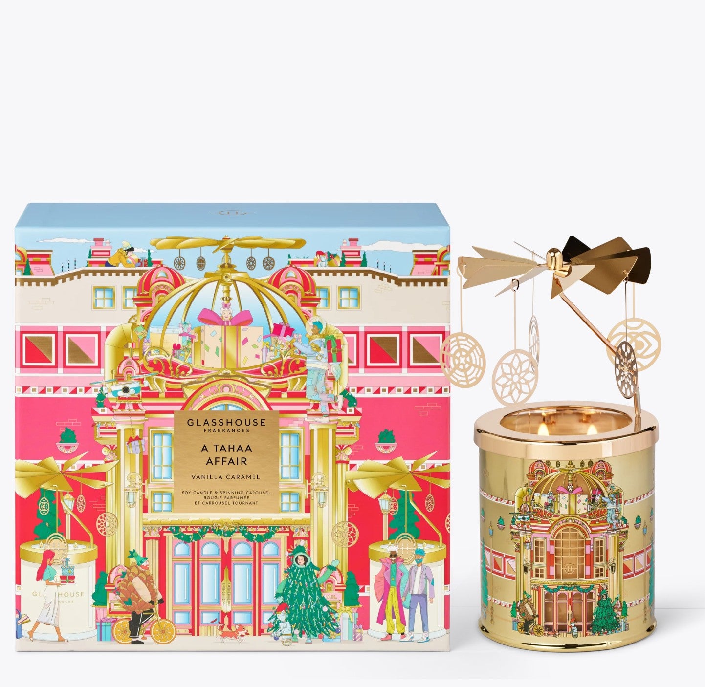 Conatins 1 x 380g A Tahaa Affair Candle and 1 x spinning carousel all wrapped in a gorgeous boxed gift set with illustartions by Aeoniumsky.