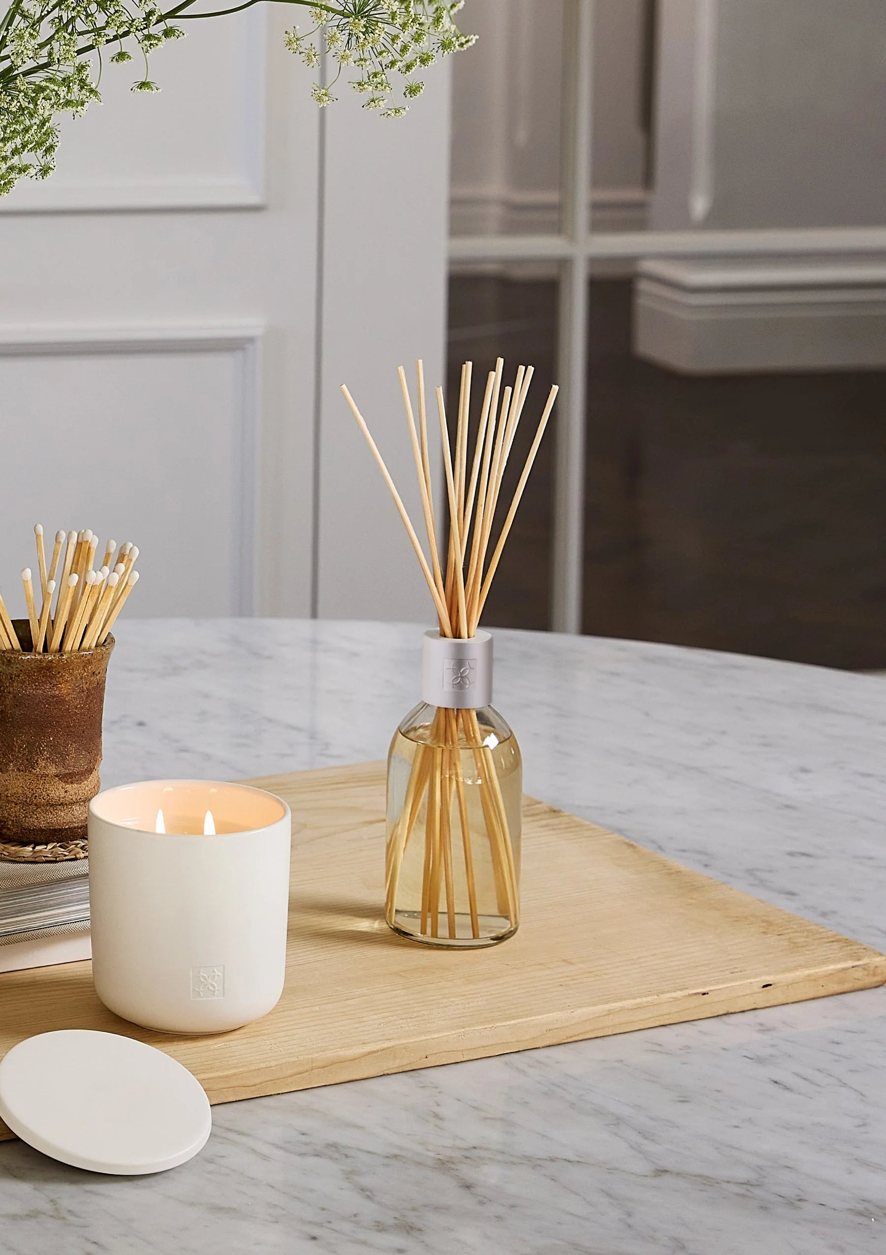 Remove the cap and replace with the diffuser collar. Add reeds and turn regularly to refresh fragrance.