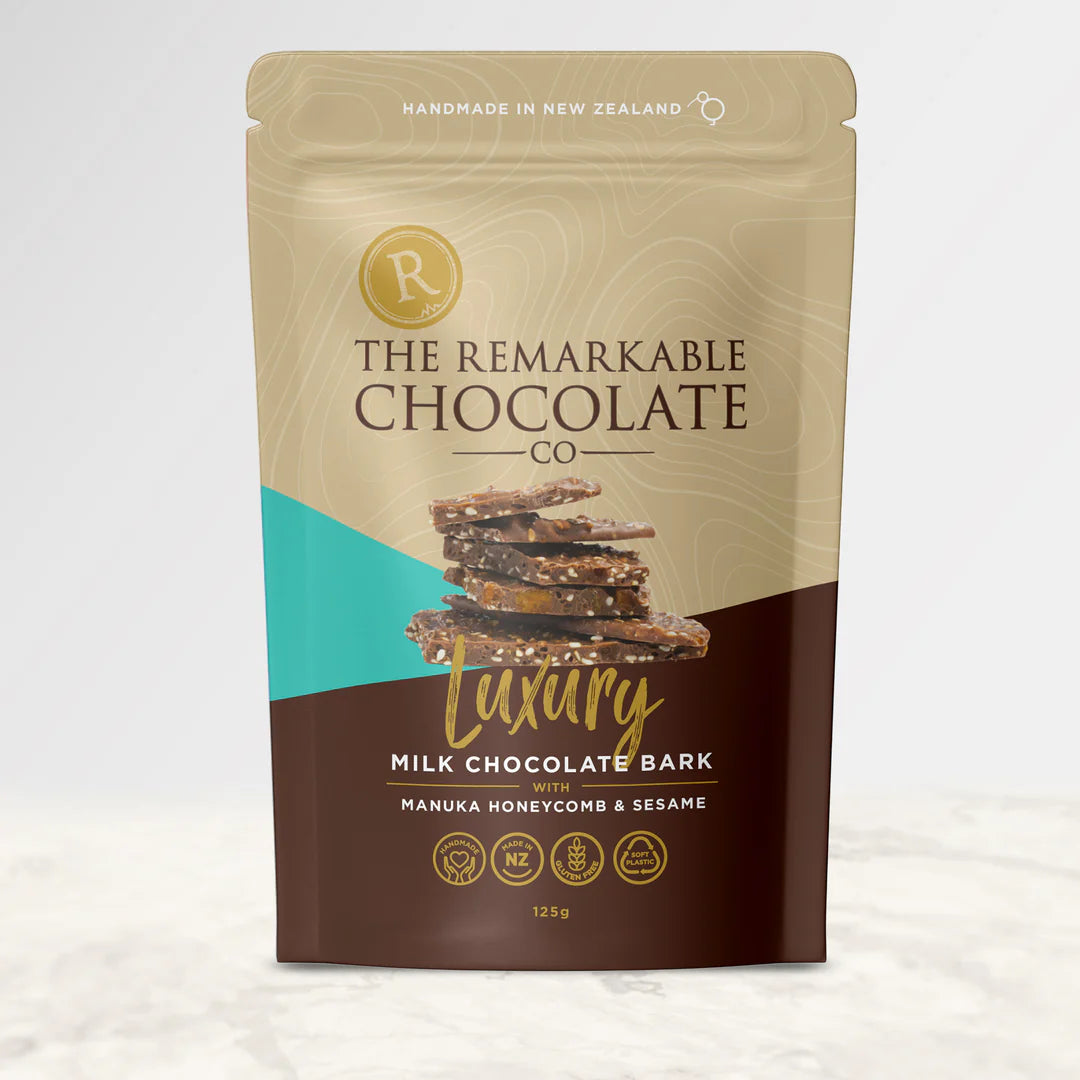 Savour the rich flavours of milk chocolate Luxury Bark, packed with crunchy manuka honeycomb and sprinkled with aromatic sesame seeds. Presented in bite-sized chunks inside a 125g pouch, this handmade New Zealand treat offers the perfect blend of smooth, nutty, and bold.