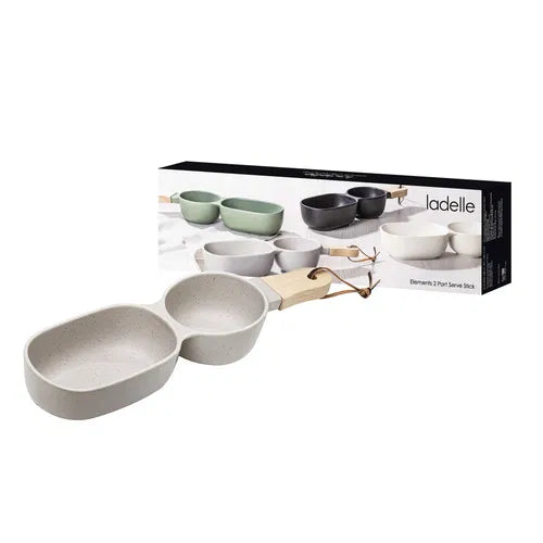 Entertain in style or treat your self to a mini snack tray. Two compartments, made of stoneware with a rubberwood handle. 34.5cm x 9.5 cm x 4.8cm