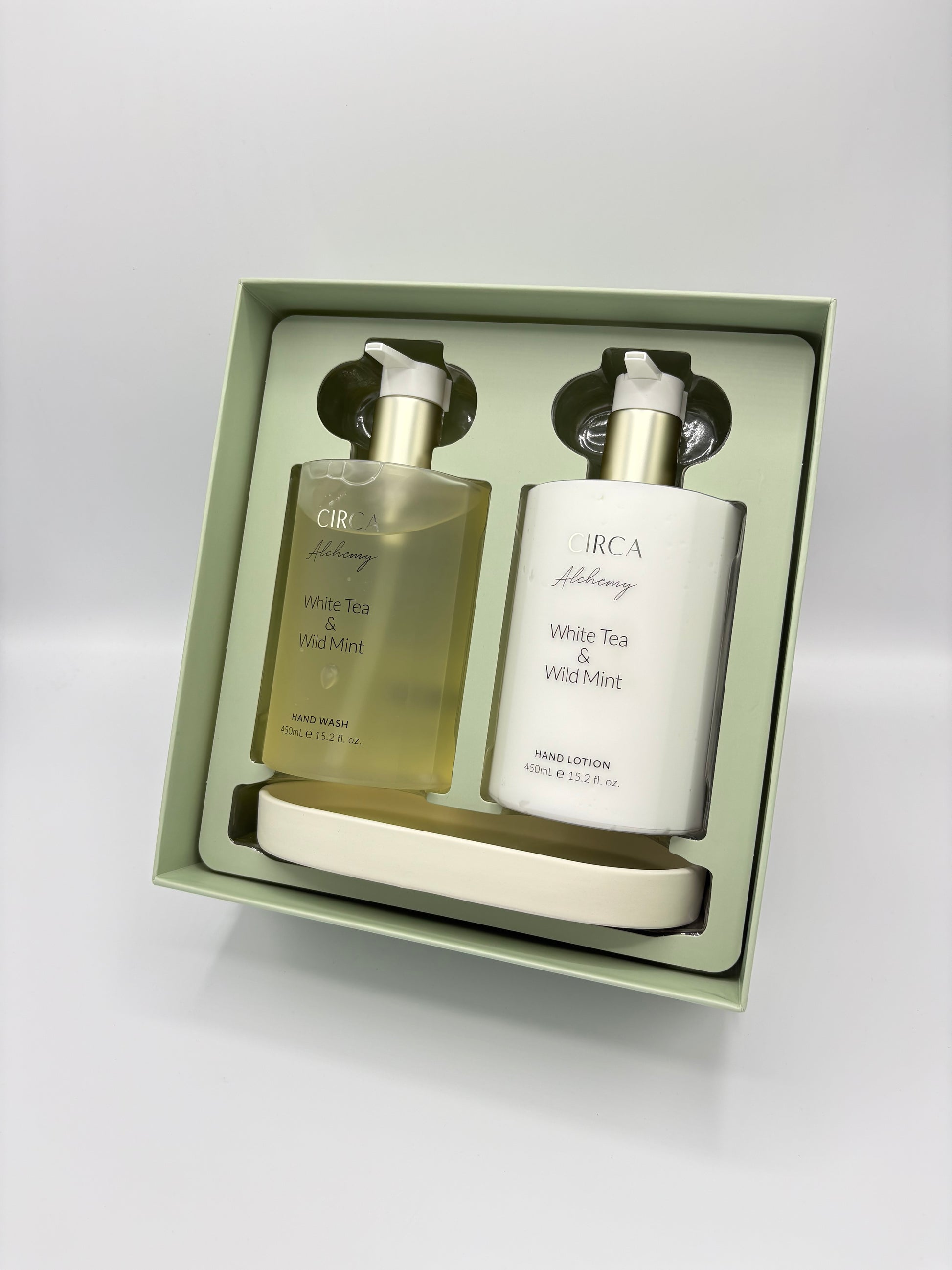 - Circa Hand Wash & Lotion set on a ceramic tray